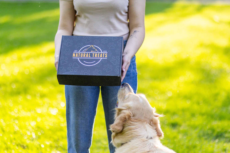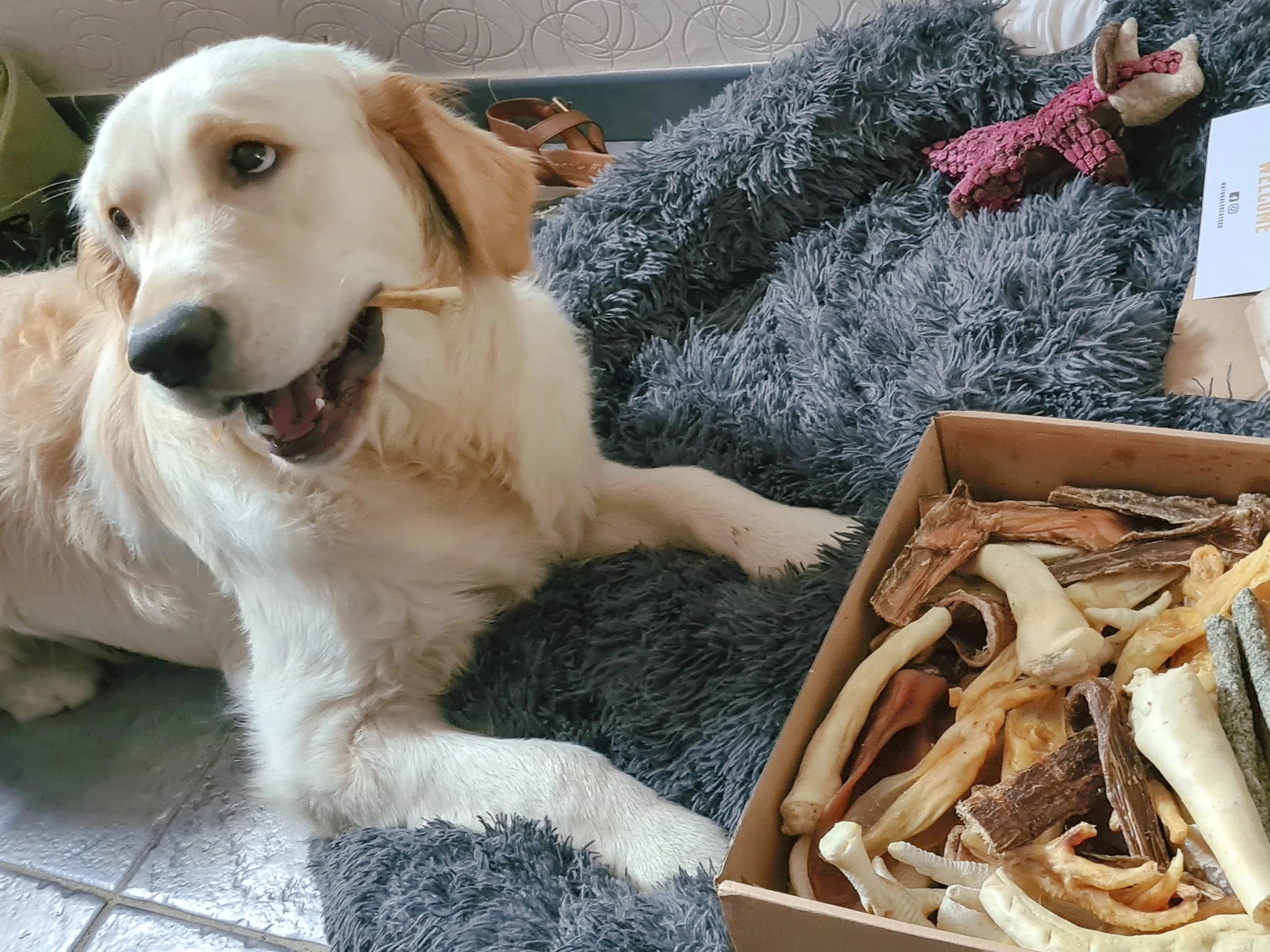 Our dog treats box for small dogs contains a selection of 100% natural dog treats and chews that are designed for smaller dogs that find larger dog treats challenging to chew.